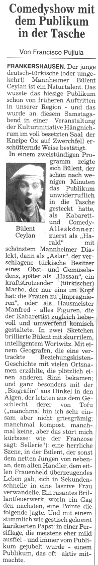 Bülent Ceylan Presse HNA Di., 26. November 2002 (97kB) Presse WR Mo., 25. November 2002 (70kB) Eine Veranstaltung im Rahmen der Aktionswoche "Kultur und Gewalt" der LAKS Hessen. Alle Veranstaltungen unter www.hessen-szene.de. Flyer im PDF-Format (30kB). |