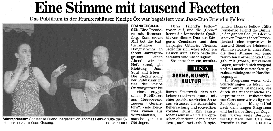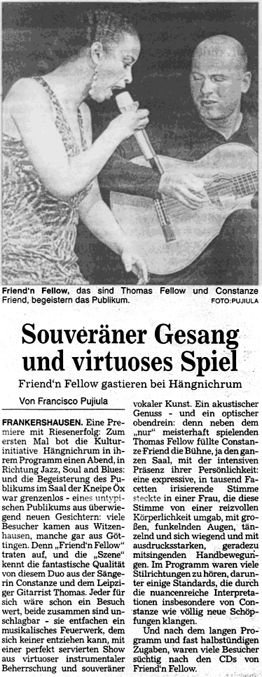 Friend´n´Fellow Presse HNA Di., 21. Januar 2003 (135kB) Presse WR Mo., 20. Januar 2003 (100kB) |