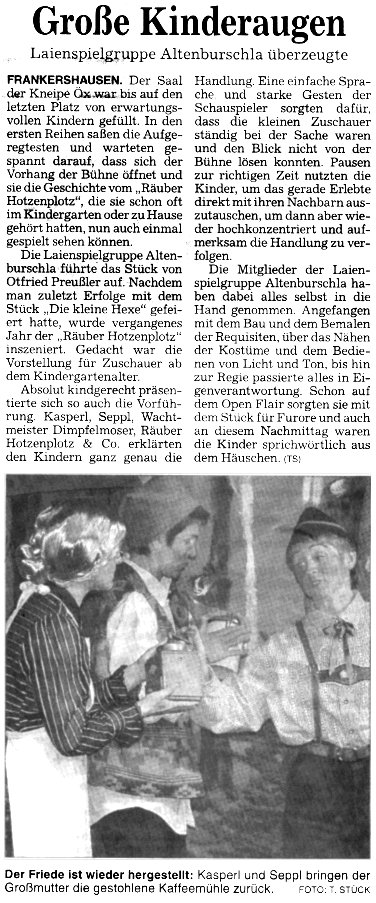 Laienspielgruppe Altenburschla Presse WR Mi., 27. November 2002 (109kB) Eine Veranstaltung im Rahmen der Aktionswoche "Kultur und Gewalt" der LAKS Hessen. Alle Veranstaltungen unter www.hessen-szene.de. Flyer im PDF-Format (30kB). |
